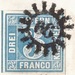 | Der Mühlradstempel 66 in 1. Verteilung mit abschließendem Punkt. Meist unsaubere Abschläge, seltener Mühlradstempel. |