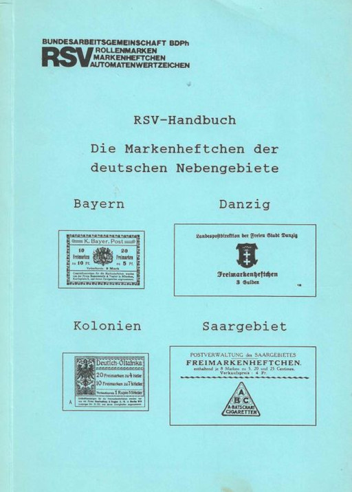 - Das von der Arbeitsgemeinschaft RSV verausgabte Handbuch der Markenheftchen befasst sich mit den Nebengebieten Bayern, Danzig, Kolonien und dem Saargebiet. Viele s/w-Abbildungen.