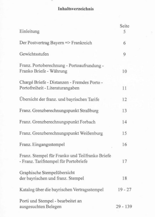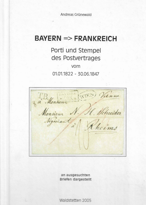 - Das gebundene Buch behandelt anhand unzähliger Belege die unterschiedlichsten Porti im Postverkehr zwischen Bayern und Frankreich. In der Einführung wird detailliert auf den Postvertrag, die Gewichtsstufen und Tarife sowie Stempel eingegangen. Der Hauptteil glänzt durch viele Farbabbildungen und ausführlicher Erläuterung.