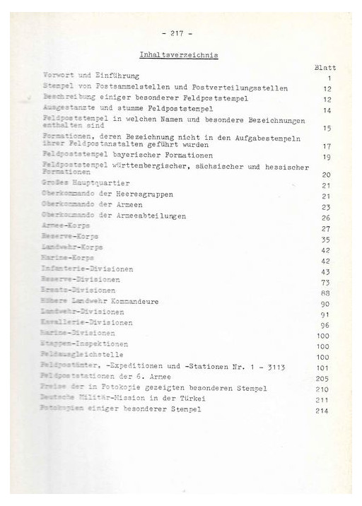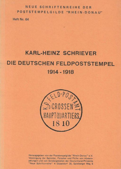 - Das Heft Nr.64 der Poststempelgilde „Rhein-Donau“ befasst sich mit den deutschen Feldpoststempel während des ersten Weltkriegs. Kompakt in Tabellenform inkl. Bewertung dargestellt.